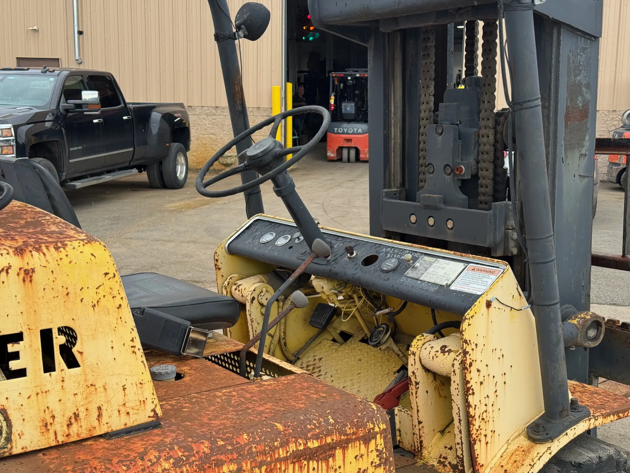 OLD WORK HORSE! 15,000# CAPACITY, LP FUEL, OIL CLUTCH/STANDARD SHIFT-3 SPEED, CUSHION TIRES, 83″ MAST WITH 162″ LIFT/TRIPLE STAG MAST, 48″ FORKS, RUNS GREAT!!!